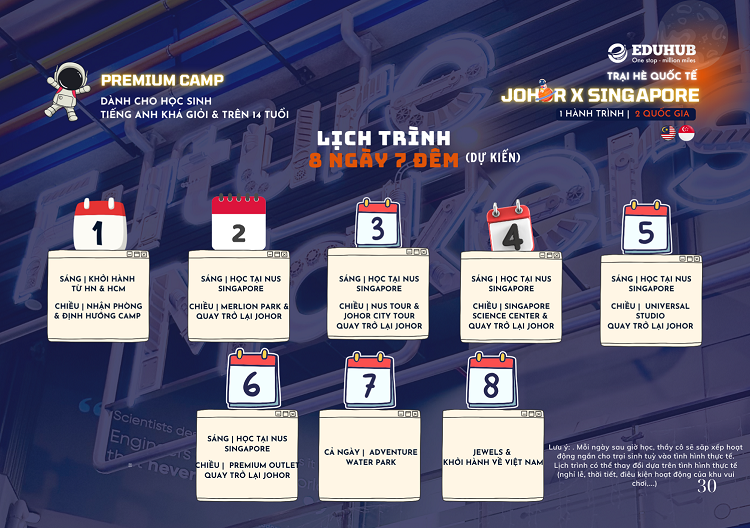 Chương trình trại hè MỘT HÀNH TRÌNH HAI QUỐC GIA PREMIUM CAMP là chương trình trại hè quốc tế do đơn vị EDUHUB- đơn vị tiên phong tại Việt Nam trong việc tổ chức trại hè quốc tế Johor – Singapore, mang đến hành trình học tập chất lượng tập trung vào việc cân bằng giữa trải nghiệm giáo dục và khám phá tại hai quốc gia Singapore và Malaysia. Từ năm 2019, hơn 300 học sinh Việt Nam đã tham gia chương trình, góp phần đánh dấu những bước nhảy vọt trong học tập và kỹ năng sau chỉ 2 tuần hoặc 4 tuần trại hè Johor Singapore