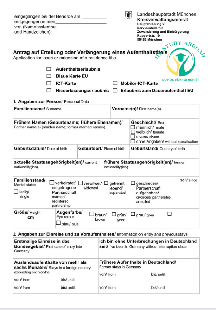 1. Đơn xin đã hoàn thành. Đơn xin giấy phép cư trú được gọi là Antrag auf Erteilung eines Aufenthaltstitels trong tiếng Đức. Ví dụ, đây là đơn xin cấp thị thực cho Munich.